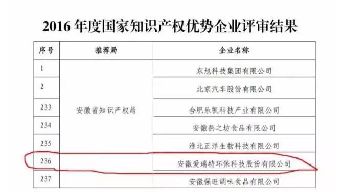 關于2016年度國家知識產權示范企業和國家知識產權優勢企業評審和復核結果公示的通知